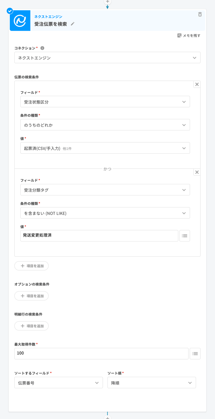 💡同じ受注伝票の複数回処理を防ぐために、処理をした受注伝票には受注分類タグを付与します。受注伝票の検索条件でこのタグを「含まない」で検索することで、同じ受注伝票の複数回処理を防ぎます。
