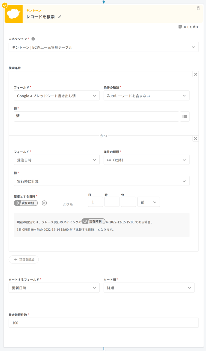 Google スプレッドシートに書き出したいキントーンのレコードを検索します。以下の設定は一例です。