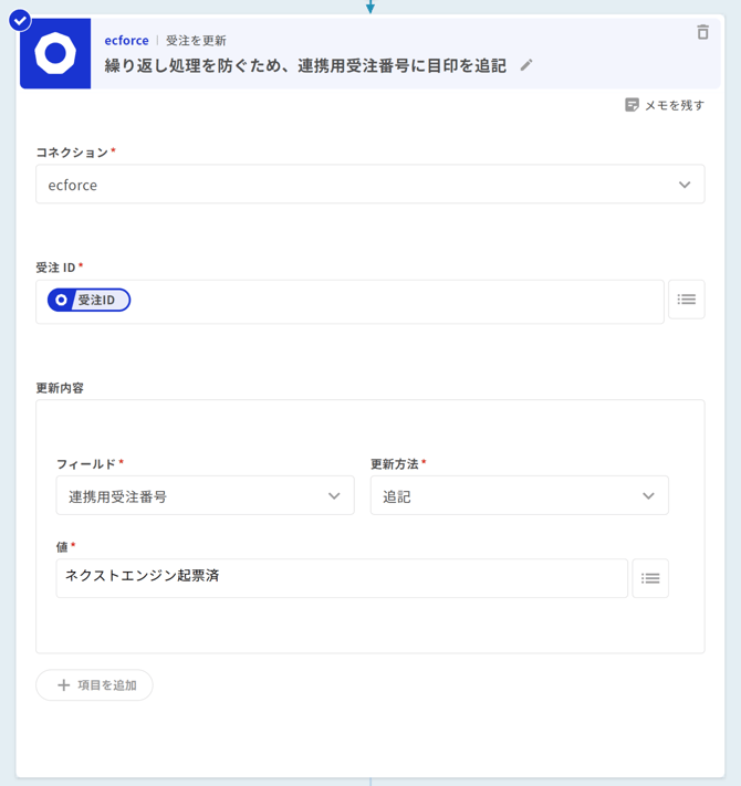 15. ecforce|受注を更新「繰り返し処理を防ぐため、連携用受注番号に目印を追記」